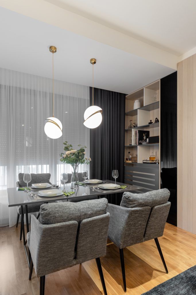 Apartamentul de trei camere este situat intr-un bloc nou din nordul Bucurestiului. Dispune de doua bai, bucatarie, doua dormitoare si un living generos cu zona de dining integrata. Alegerile curajoase definesc in totalitate stilul amenajarii.