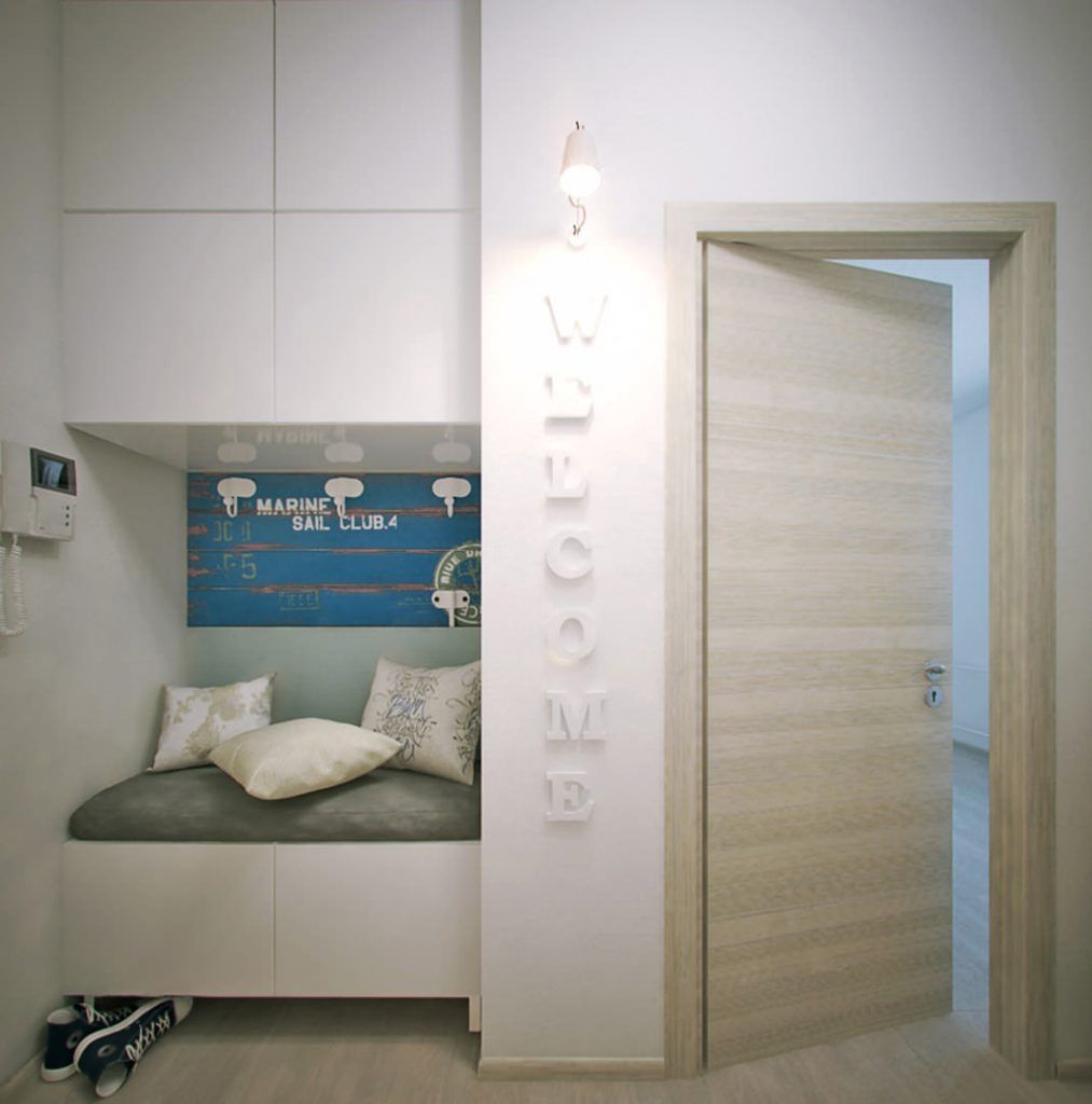 Personalizat este si spatiul holului prevazut si el cu dulapuri si o bancuta, precum si un mesaj de bine ai venit! care ar putea fi personalizat cu orice alt text in functie de spatiu si dispunere.