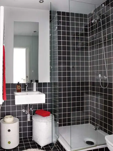 In baie atat peretii cat si pardoseala sunt placati cu acelasi tip de flise, negre, instalatiile sanitare, precum si alte accesorii ramanand albe pentru un contrast plin de profunzime. Accentele de rosu insotesc si aici decorul creat, continuand tematica celorlalte camere.