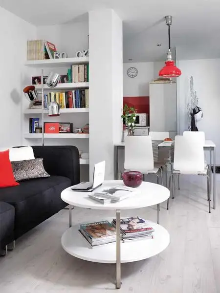 Spatiul dedicat zonei de zi este completat cu o masuta de cafea rotunda care, la randu-i, preia din depozitarea revistelor. Dar cel mai interesant aspect este tabloul abstract de deasupra canapelei care reuseste cu succes sa creeze un punct de interes, privirea fiind atrasa de jocul culorilor de pe fundalul alb al panzei.
