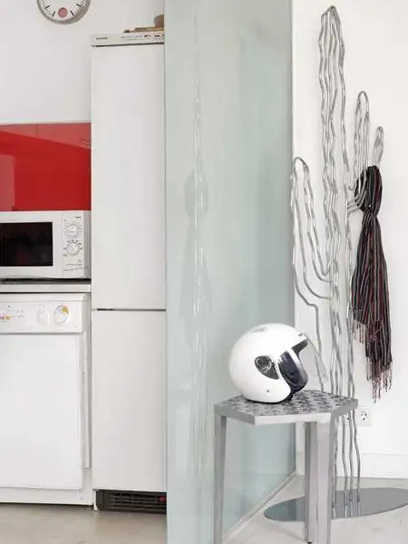 Un perete din sticla separa vizual bucataria de spatiul de la intrare, marcat printr-un cuier ingenios cu forma de cactus.