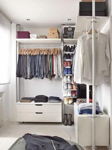 Chiar si in dormitor vom regasi un perete accent de un rosu burgund saturat cu un tablou tip print. S-a optat aici pentru o nuanta de rosu mai potolita cunoscute fiind efectele rosului asupra starii de spirit. Spatiile de depozitare pentru haine este un sector deschis cu sertare si bare pentru haine precum si rafturi suport pentru incaltari.