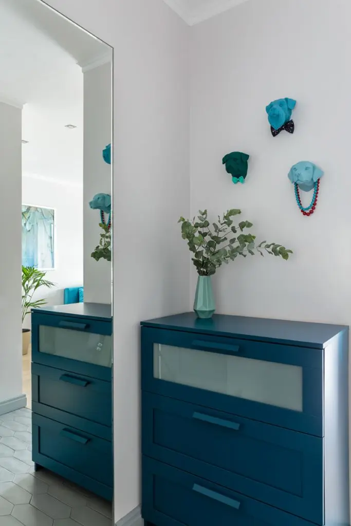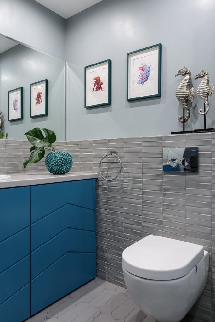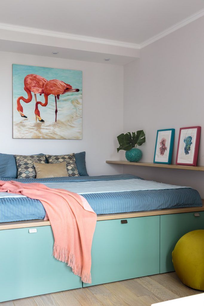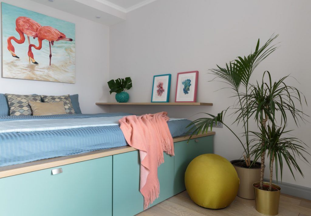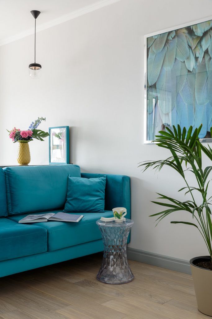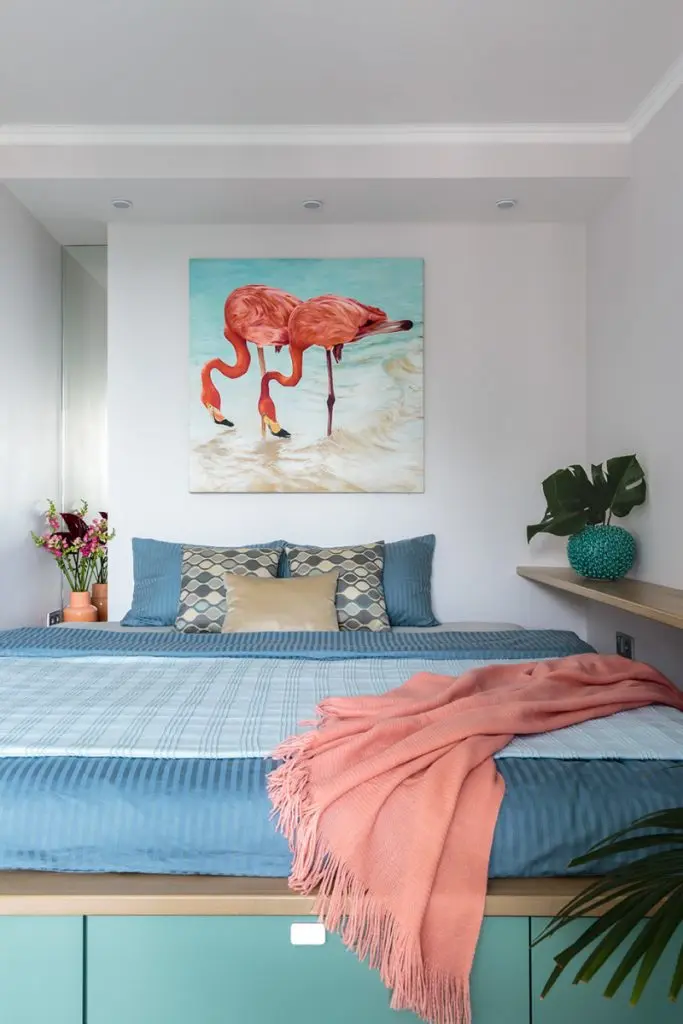 La baza paletei cromatice regasim tonuri placute de gri care creeaza fundalul optim pentru tema exotica a amenajarii, pe care o regasim in culorile puternice folosite la mobilier (nuante de albastru roial, turqoise) cat si la decoratiuni (tabloul cu flamingo din dormitor, patternul pernelor decorative si al draperiei).