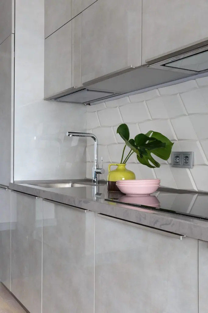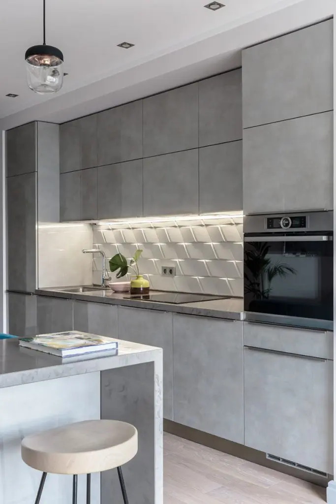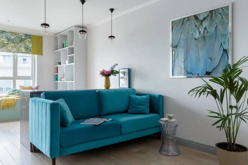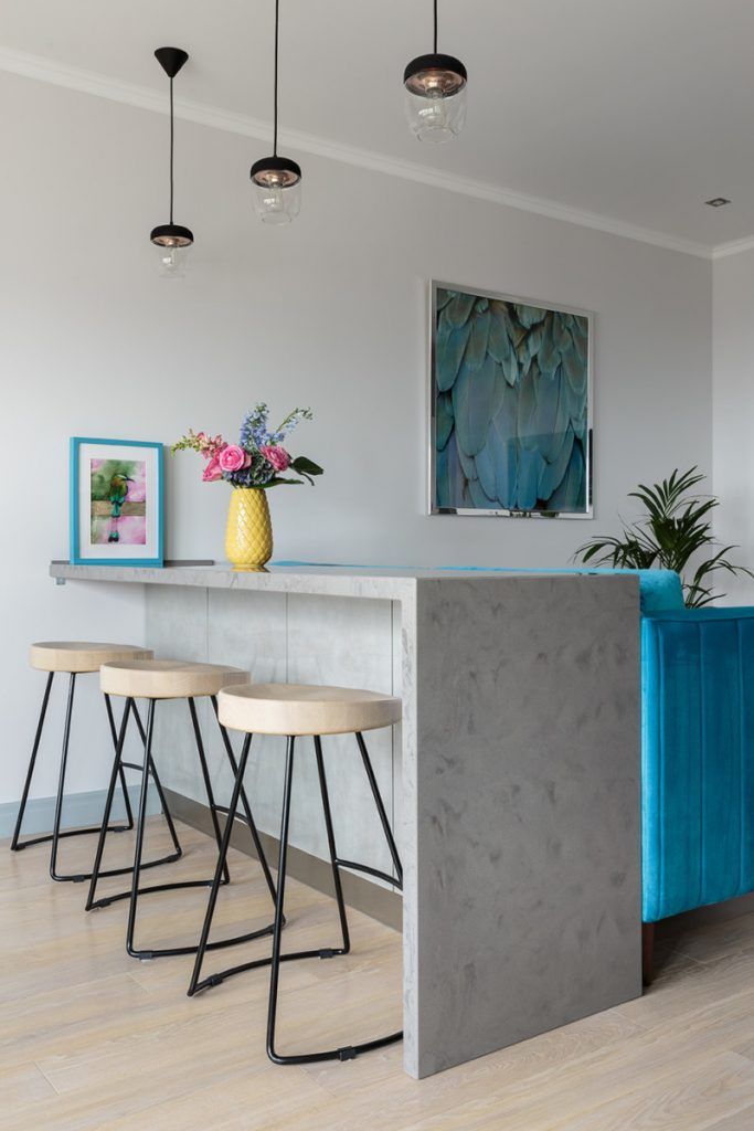 Canapeaua turquoise din catifea impreuna cu barul din spatele acesteia formeaza nucleul locuintei. Barul ese o prelungire fireasca a bucatariei, avand acelasi finisaj gri texturat al fetelor de usi (cu aspect industrial); creeaza un contrast placut cu nuanta intensa a canapelei.