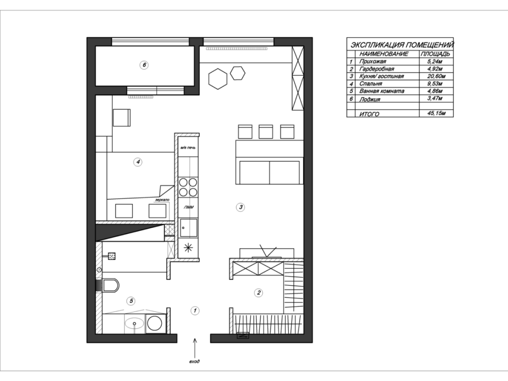 Prin modificarea compartimentarii initiale a fost creat un open space: bucatarie cu living si dormitor partial deschis. Rezultatul de succes al reamenajarii s-a bazat pe eliminarea usilor care nu erau pe deplin necesare si utilizarea oglinzilor ca truc pentru a mari vizual spatiul.