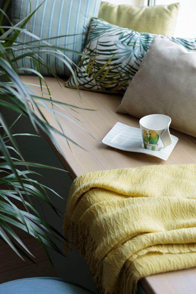 Glaful din lemn natur a fost realizat la comanda intr-un atelier local, dupa schitele si indicatiile designerului. Decorat cu perne si paturi moi, a fost creat locul ideal pentru a savura in liniste o cafea dimineata sau pentru a citi si a admira privelistea pe timpul serii.