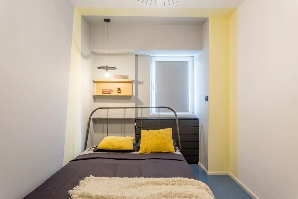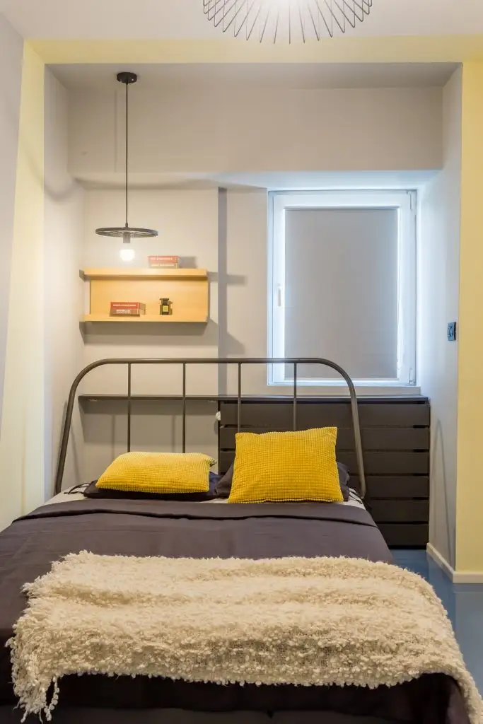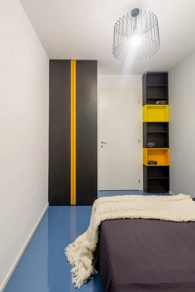 In dormitor, amenajat in locul fostei bucatarii, s-a mers pe aceeasi schema de culori ca in restul apartamentului: gri si accente de galben, cu pardoseala albastra. Linia grafica in nuanta galbena de pe pereti aduce dinamism interiorului. Patul este IKEA.