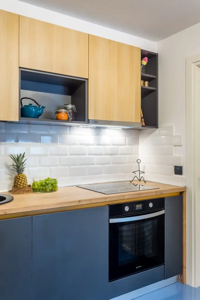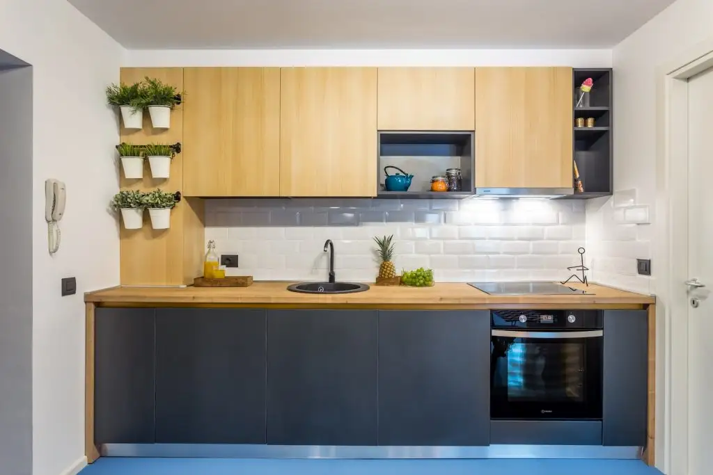 Pentru amenajarea bucatariei, acum relocata in hol, s-au folosit electrocasnice incorporabile si o mobilare compacta, liniara, eficientizand spatiul. Si mobilierul bucatariei a fost realizat tot de Euphorica Design.