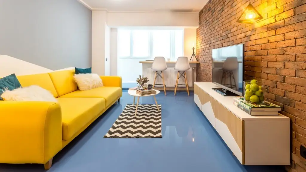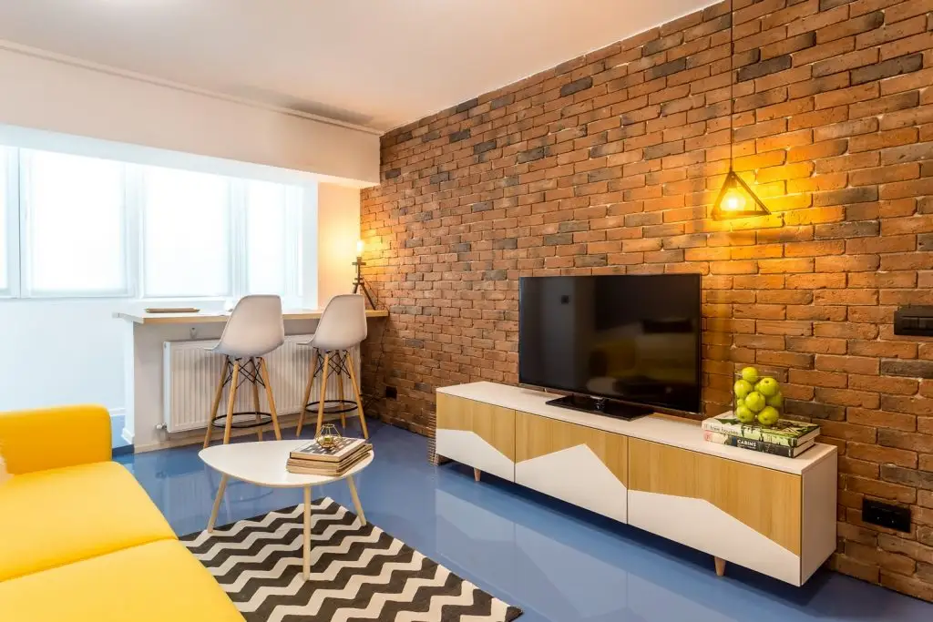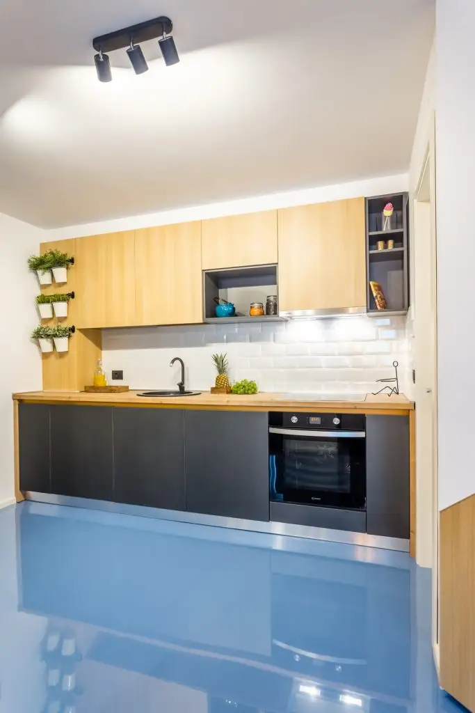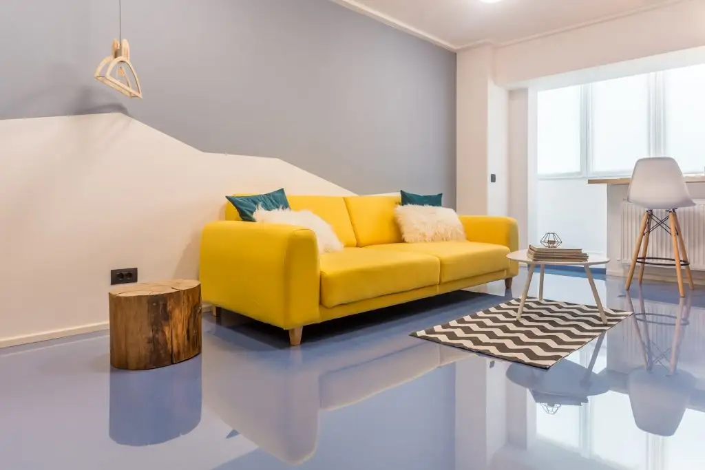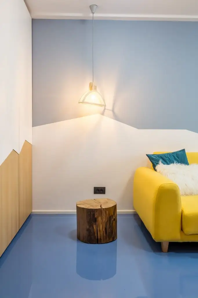 Cromatic, amenajarea este una vesela si colorata, cu o baza neutra, formata din alb cu gri-antracit si potentata de accente galbene si insertii de lemn aplicate pe fronturile corpurilor de mobilier. Astfel, in living, s-a optat pentru o canapea galbena, in contrast cu pardoseala albastra din rasina epoxidica (aplicata cu ajutorul echipei de la Epoxy Studio).