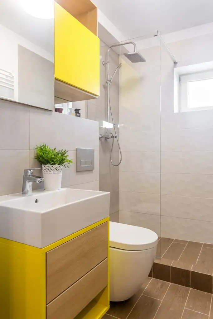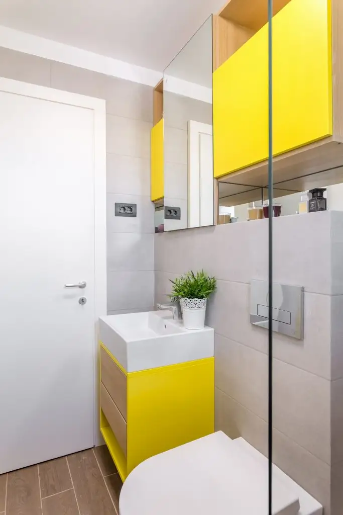 In baie, decorul creat preia din linia generala a amenajarii. S-au folosit placi de faianta alba tridimensionala, placi simple gri, iar pentru a incalzi spatiul, gresie cu aspect de lemn si mobilier galben solar. Faianta, gresia si sanitarele sunt de la Delta Studio.