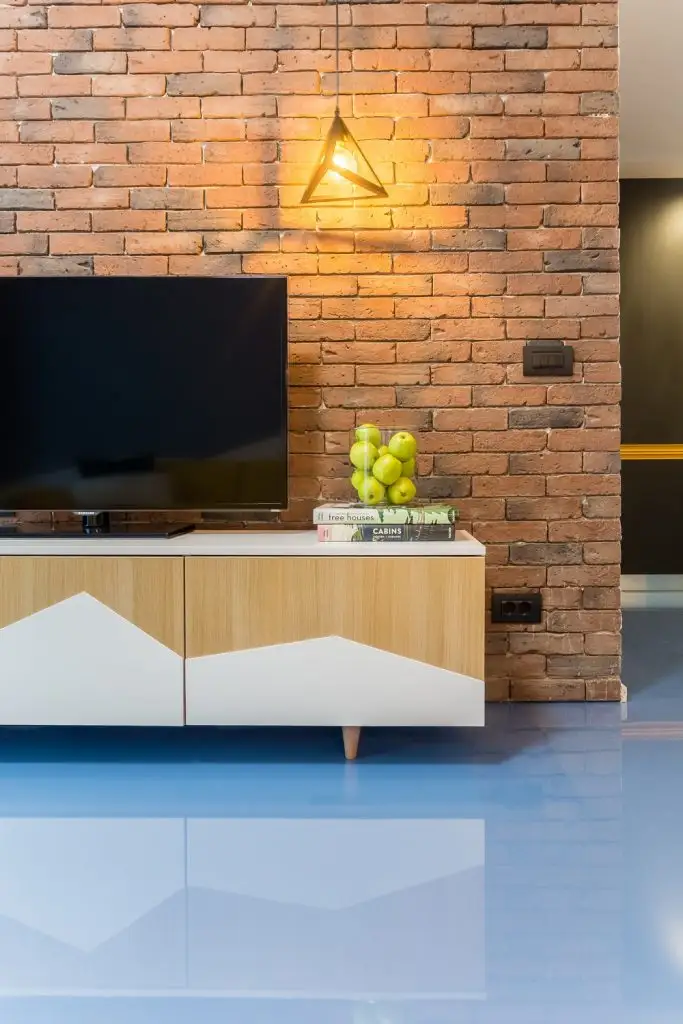 Peretele din caramida aparenta imprima un aer industrial spatiului, iar buturuga folosita ca masuta laterala completeaza seria accesoriilor speciale.