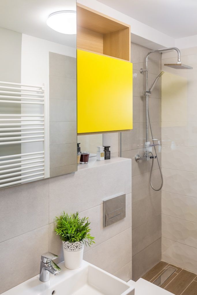 In baie, decorul creat preia din linia generala a amenajarii. S-au folosit placi de faianta alba tridimensionala, placi simple gri, iar pentru a incalzi spatiul, gresie cu aspect de lemn si mobilier galben solar. Faianta, gresia si sanitarele sunt de la Delta Studio.