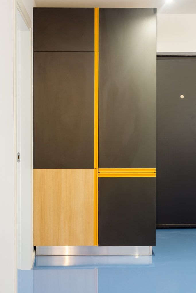 Cromatic, amenajarea este una vesela si colorata, cu o baza neutra, formata din alb cu gri-antracit si potentata de accente galbene si insertii de lemn aplicate pe fronturile corpurilor de mobilier. Astfel, in living, s-a optat pentru o canapea galbena, in contrast cu pardoseala albastra din rasina epoxidica (aplicata cu ajutorul echipei de la Epoxy Studio).