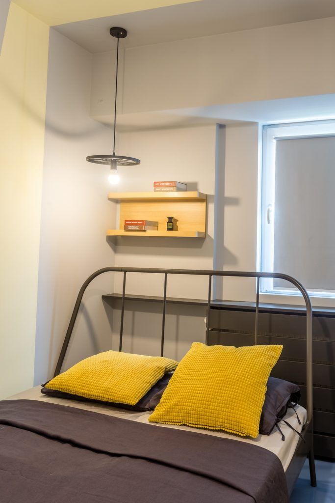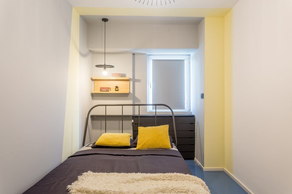 In dormitor, amenajat in locul fostei bucatarii, s-a mers pe aceeasi schema de culori ca in restul apartamentului: gri si accente de galben, cu pardoseala albastra. Linia grafica in nuanta galbena de pe pereti aduce dinamism interiorului. Patul este IKEA.