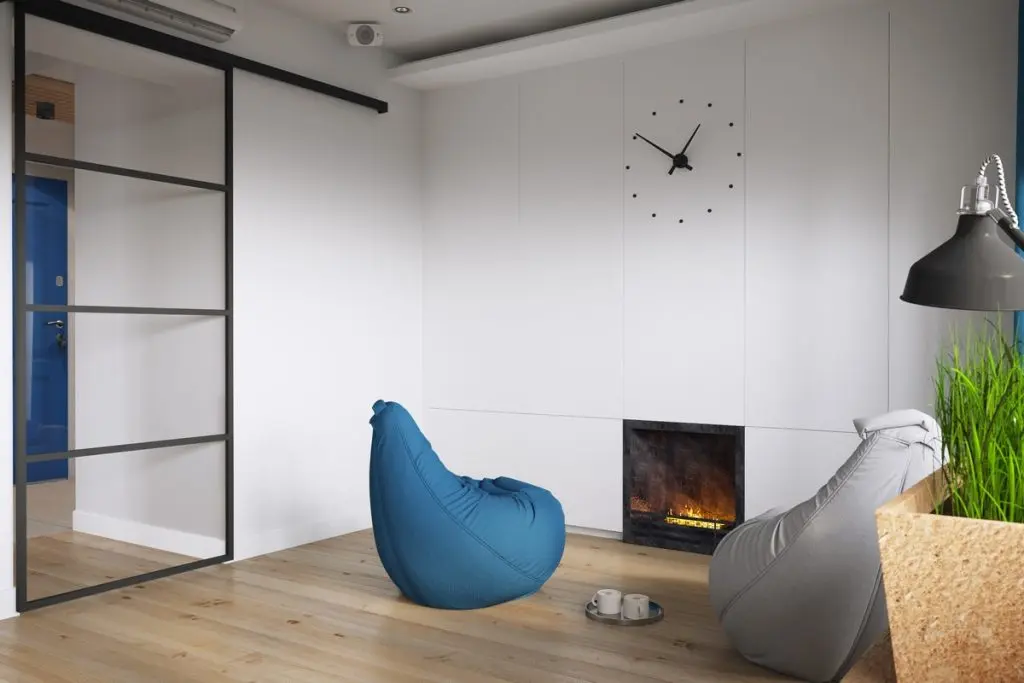 Semineul care functioneaza pe baza de bioetanol aminteste de interioarele scandinave si confera un aer reconfortant interiorului. Capatul de perspectiva al camerei este conturat printr-un perete-accent zugravit in gri cu o etajera suport pentru tablouri si un lampadar potrivit pentru o lumina ambientala.