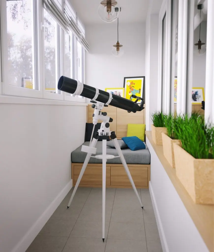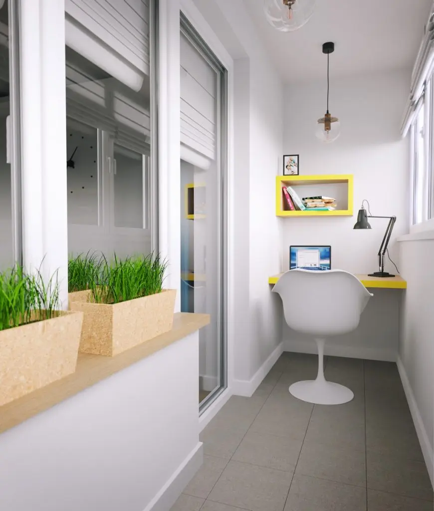 Balconul a fost gandit ca o zona de lucru pe de o parte, cu un mini-birou amenajat din blat si raft galben, iar in capatul opus, ca un spatiu pentru relaxare. Ideea platformei din living este preluata si aici, evident la o scara mai mica, cu spatii de depozitare utile.