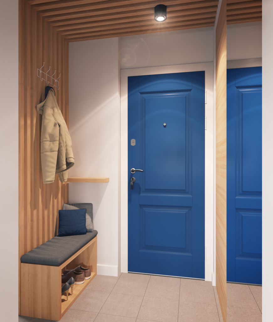 Fiecare detaliu a fost atent gandit. Spatii de depozitare intalnim si in hol. Desi comunica direct cu bucataria, spatiul este delimitat vizual printr-o partitie din sipci furniruite ce se prelungesc si pe tavan, creand un frumos ambient alaturi de albastrul usii. Cele 2 usi de pe hol ascund pe rand, un dulap pentru depozitare si cea cu oglinda, intrarea in baie.