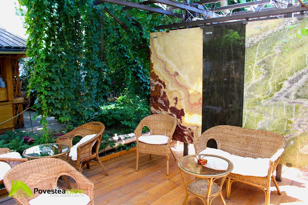 In aceasta gradina plantele joaca un rol foarte important. Iedera care a cuprins pergola de metal ce acopera separeurile armonizeaza foarte bine spatiul construit cu natura.