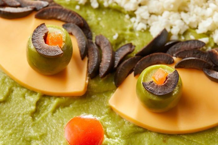 Decorează ochii și sprâncenele: Utilizează măslinele verzi pentru ochi și măslinele negre feliate pentru sprâncene, astfel încât să creezi expresia specifică personajului.