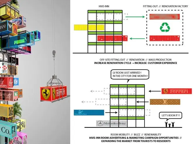 Deschide GaleriaArhitectii din Hing Kong, de la O VA Studio, au creat conceptul si designul pentru Hotelul Hive-Inn, care va fi realizat complet din containere de transprot, toate colorate si marcate cu brandurile companiilor care vor avea sediu sau magazin de prezentare in cadrul acestui hotel luxos.
