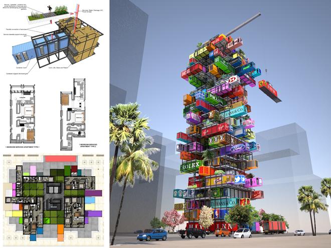 Fiecare container de transport ar avea un rol anume, fie ca va fi transformat in magazin, spatiu de birouri sau camere si apartamenteportabile, incaperile acestui hotel putand fi scoase, una cate una, ca in jocul Jenga.