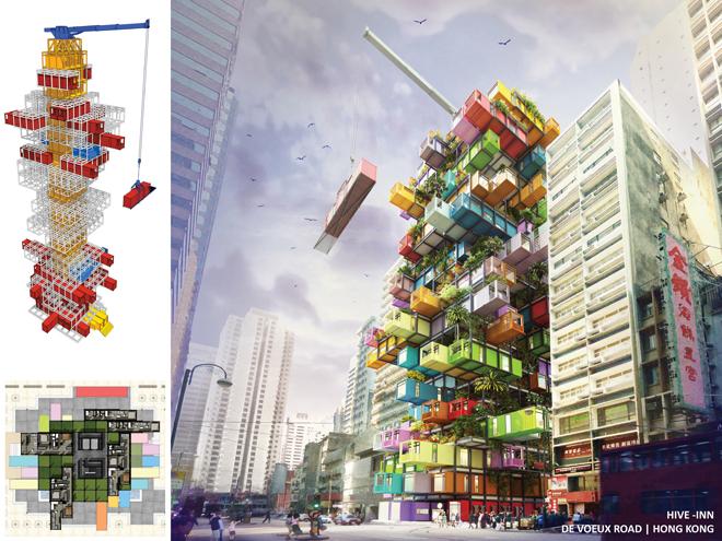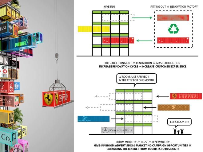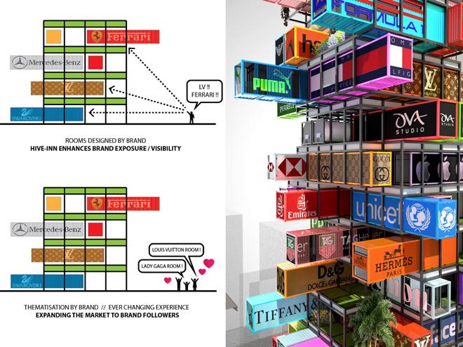 Deschide GaleriaArhitectii din Hing Kong, de la O VA Studio, au creat conceptul si designul pentru Hotelul Hive-Inn, care va fi realizat complet din containere de transprot, toate colorate si marcate cu brandurile companiilor care vor avea sediu sau magazin de prezentare in cadrul acestui hotel luxos.
