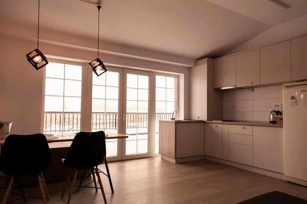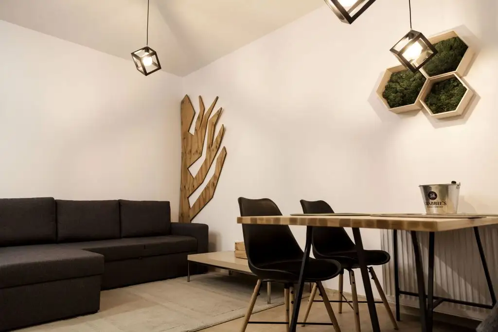 Printr-o bine structurata mobilare, spatiul este mai mare decat te astepti de la un apartament de 40 metri patrati. Un living deschis, un loc de luat masa cu vedere spre terasa imensa, o bucatarie in L cu priveliste spre dealurile din jur, toate te imbie sa petreci timp acolo.