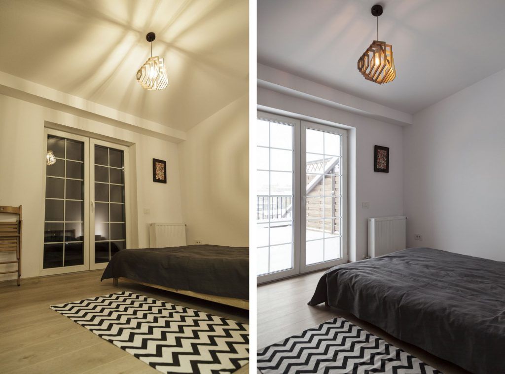 In zona de noapte, amenajarea pastreaza tonul minimalist abordat in living; patul din lemn a fost intentionat scurtat pe inaltime pentru a nu incarca vizual camera.