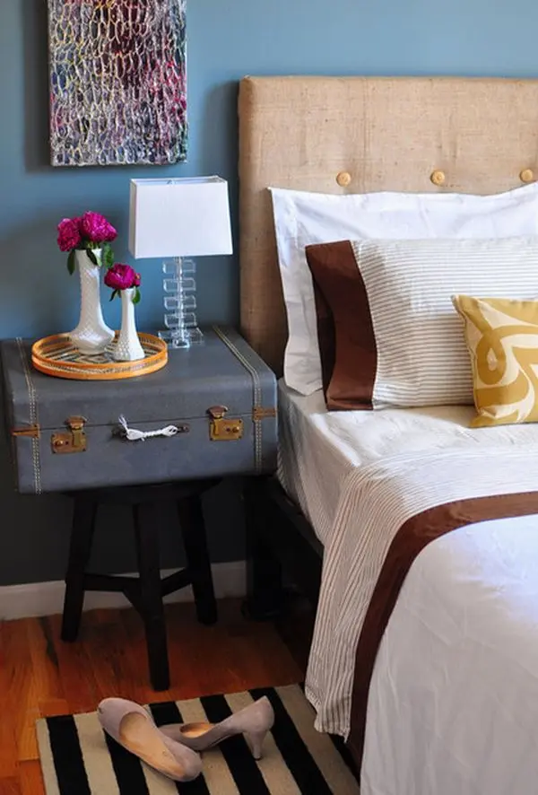 Valiza vintage pe post de noptiera un spatiu de stocare inedit.