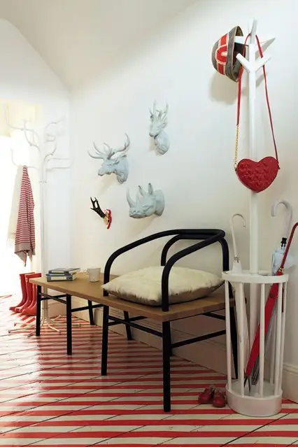 Un hol care impresioneaza: culori puternice, dungi rosii si mulaje de animale