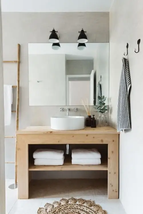 Daca alegi sa plasezi rafturi, le poti umple cu cateva cosuri din lemn, ideale pentru a pastra in ordine gelurile de dus si micile accesorii.