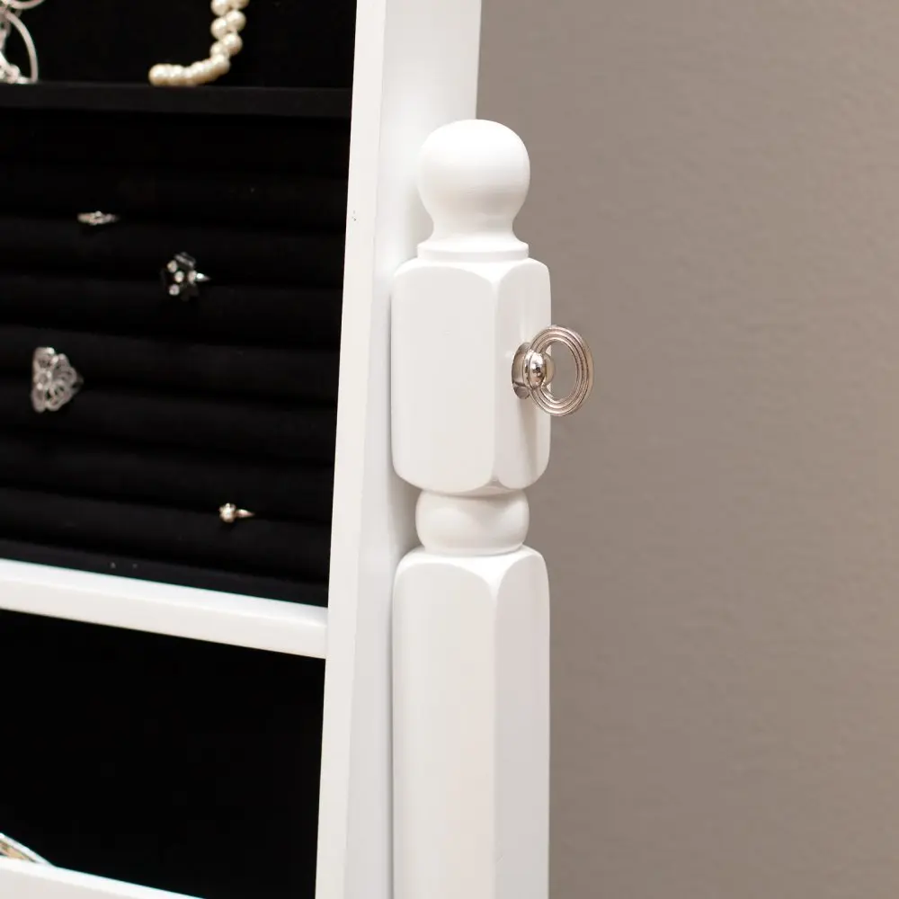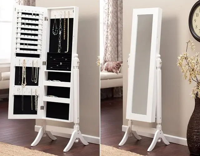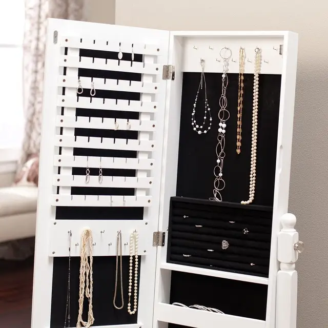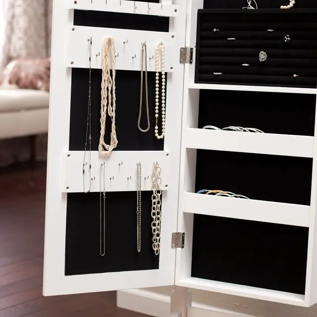 Nici cerceii nu sunt neglijati acestia avand la dispozitie un intreg rastel in care se prind cu usurinta. Inelele au si ele compartimentul lor din catifea, iar pe usa lazii se mai pot depozita nenumarate alte bijuterii.