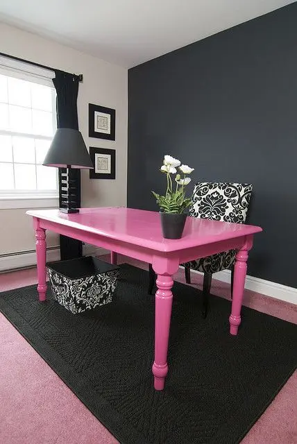 Negrul se combina armonios cu galbenul, rosul, portocaliul si albastrul, astfel ca adaugand elemente de mobilier sau decoratiuni cu aceste culori, veti avea un birou modern. Este bine de stiut ca acest tip de vopsea se gaseste si in alte culori, daca negrul nu este pe placul dumneavoastra.