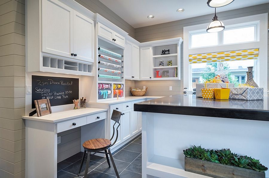 Peretele cu vopsea scolara va fi locul in care va puteti exprima creativitatea; fie ca alegeti sa desenati sau sa lasati mesaje motivationale atat pentru dumneavoastra cat si pentru ceilalti membrii ai familiei care folosesc biroul. Va puteti planui calatoriile sau excursiile, puteti face planuri si scheme pe care sa le puteti impartasi cu familia si prietenii sau chiar realiza un colaj de fotografii doar pentru a completa decorul peretelui respectiv.
