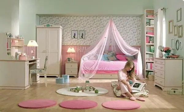 Daca domnisoara doreste ceva trainic puteti alege un pat cu baldachin, lenjerie cu inimioare sau motive florale, covorase sub forma de fluturi, veioze cu abajur romantic.