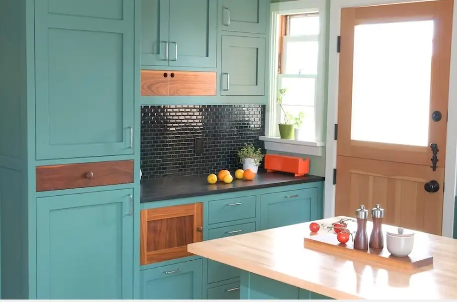 O bucatarie moderna nu se caracterizeaza doar prin culori albe si metalice si aspecte netede si lucioase. Culorile sunt binevenite cand vorbim despre dulapurile de bucatarie. Imaginati-va o paleta de culori pe placul dumneavoastra si construiti in jurul ei: dulapurile, blatul, flisele, si pervazul ferestrei. Turcoaz, putin verde, cateva accente de portocaliu si galben si lemnul blatului.