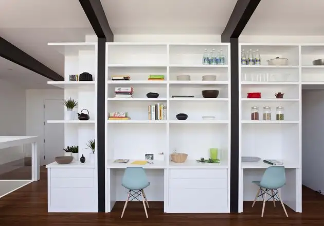 Rafturi deschise, aerisita care fac legatura intre camere living, birou si bucatarie