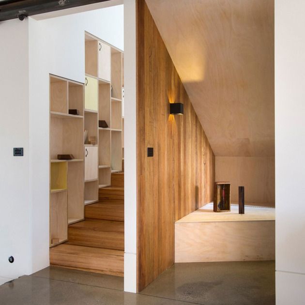 Rafturi deschise, aerisita care fac legatura intre camere living, birou si bucatarie