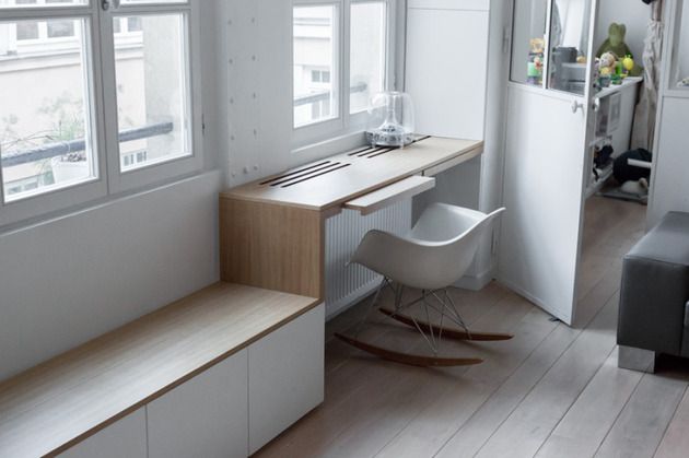 Spatiul ingust folosit la maxim birou deasupra caloriferului