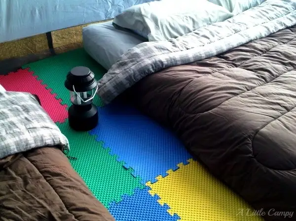 Foto 1: Foloseste un izopren sau covoare speciale pentru baie pentru un confort sporit la cort.