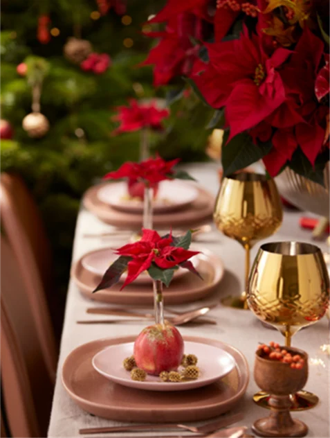 Crăciunițele în contraste strălucitoare sunt vedetele acestui decor elegant, în culori de roșu, auriu și bronz. Fie că sunt prezentate ca plantă întreagă într-un pocal auriu stilat sau ca flori tăiate puse în suporturi făcute din mere, crăciunițele conferă mesei un aer festiv.