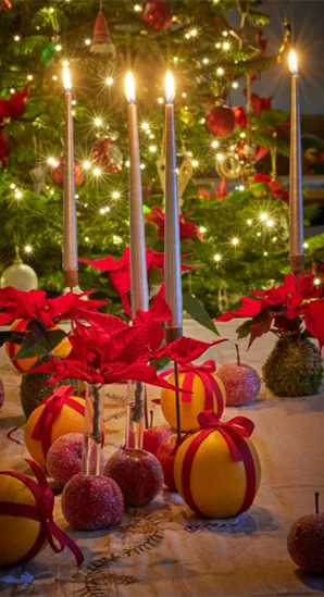 Aranjați suporturile pentru crăciunițe și lumânări pe masă alături de portocalele decorate și mai multe mere glazurate.