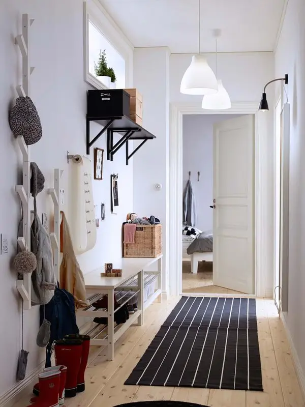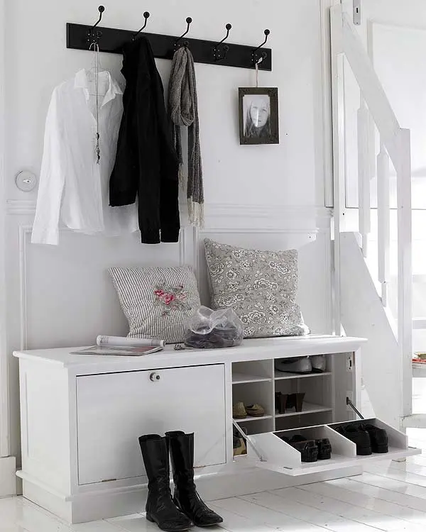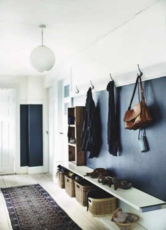 Pentru a marca zona dedicata holului, puteti folosi culori puternice ca negrul doar pe trei sferturi din perete, restul lasandu-l alb. Cateva agatatori rezistente si un blat in partea de jos pentru a aseza incaltarile si aveti din nou un spatiu ideal pentru a stoca intr-o maniera ordonata hainele de zi cu zi, posete si alte accesorii.