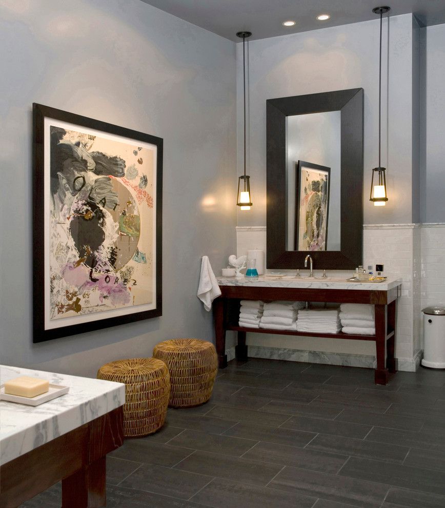 Daca aveti tablouri sau obiecte decorative in baie (sau un corp de mobilier cu o forma sculpturala), merita sa investiti in lumini de accent indreptate spre acestea, pentru a le pune in evidenta.