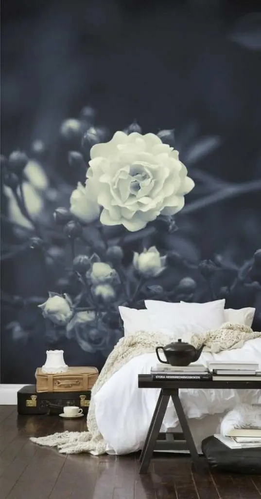 La polul opus, acest dormitor care impune prin destinatia lui alegerea unui print simplu, cu o singura culoare albastru, potrivit pentru a crea efectul de liniste si odihna. Totusi, se pastreaza scopul folosirii imprimeului, acela de a stinge monotonia, in acest caz a nuantelor neutre. Echilibrul este obtinut prin tablourile de pe perete.