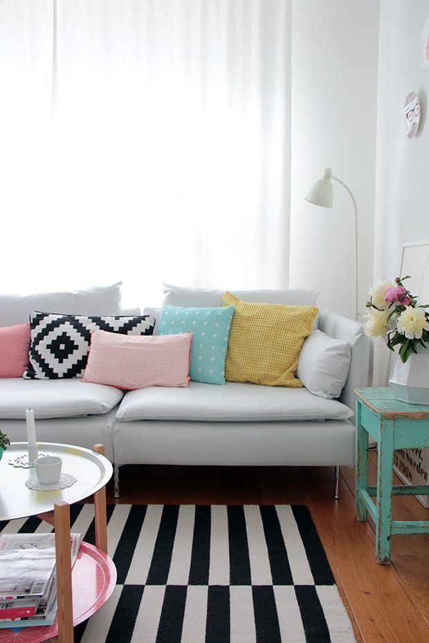 Daca spatiul e mic, asta nu inseamna ca si obiectele cu imprimeuri trebuie sa fie mici. Dimpotriva, vei crea mai mult efectul de deschidere cu un covor mare, dar care sa contina dungi sau culori simple, ca in exemplul de mai jos.