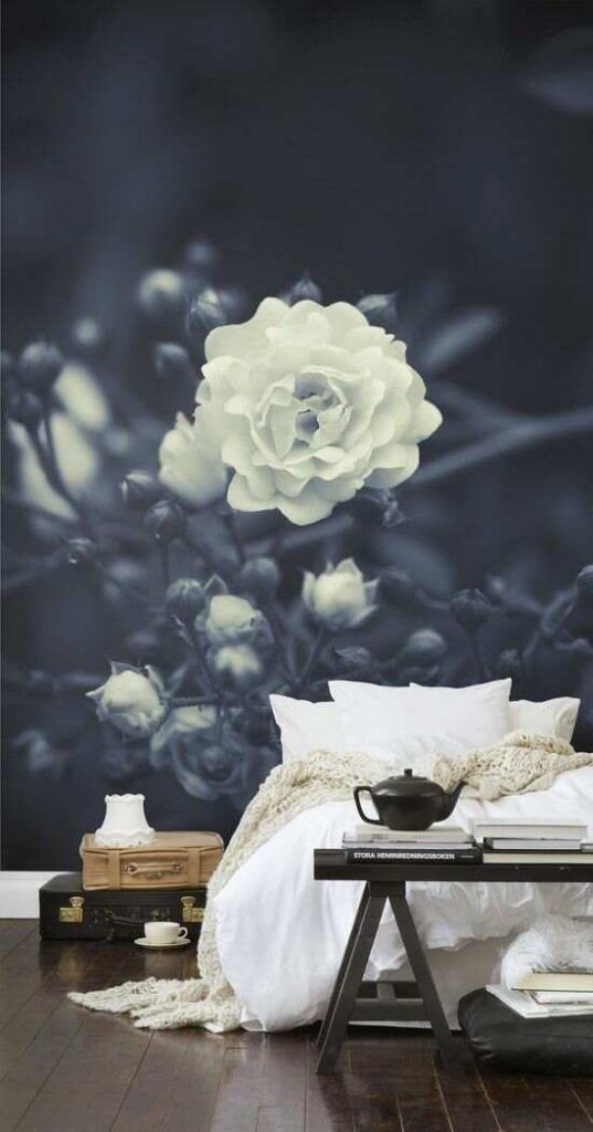 La polul opus, acest dormitor care impune prin destinatia lui alegerea unui print simplu, cu o singura culoare albastru, potrivit pentru a crea efectul de liniste si odihna. Totusi, se pastreaza scopul folosirii imprimeului, acela de a stinge monotonia, in acest caz a nuantelor neutre. Echilibrul este obtinut prin tablourile de pe perete.