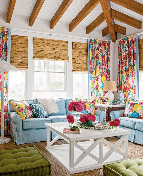 Iata un exemplu de living care abunda in culori prin imprimeurile alese. Alegere indrazneata, dar echilibrata. Jocul dintre culorile neutre si cele puternice este pastrata armonios in toata incaperea. Centrul de interes este, fara indoiala, canapeaua, a carei culori puternice este echilibrata de combinatiile de alb-negru, accentele din perdea si decoratiunile de pe rafturi si perete.