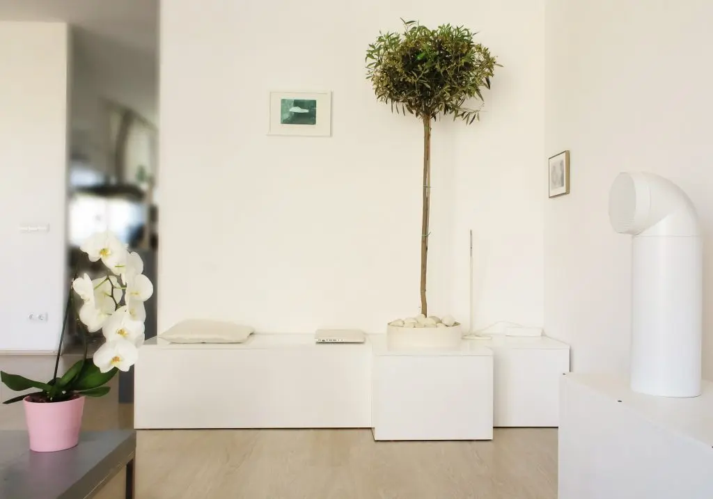 Intregul concept al apartamentului subscrie relatiei alb-gri, foarte prietenoasa cu lumina. Olivia ne ofera mai multe detalii legate optiunile de design interior ale spatiului lor personal: "Din fericire, avem gusturi comune si nu a existat niciodata vreo nepotrivire in acest sens. Spatiul este fluid, cu putine usi, punctat cromatic de nucleele verzi cu plante de interior. Pe langa orhidee, avem un maslin in jurul caruia s-a construit un obiect, tip banca sau loc de relaxare. In acest moment cred ca este locul cel mai drag noua. Am cautat diverse variante de interior cu copac built-in, conceptul de gradina inerioara sau copac interior fiind extrem de fascinant si cultivat in arhitectura contemporana cu precadere in spatii gandite pentru astfel de integrari".