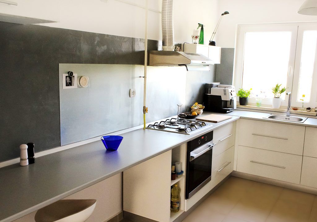 Bucataria casei a fost gandita tot ca un spatiu personalizat in care nu te intalnesti cu gresia sau cu faianta clasica pentru perete